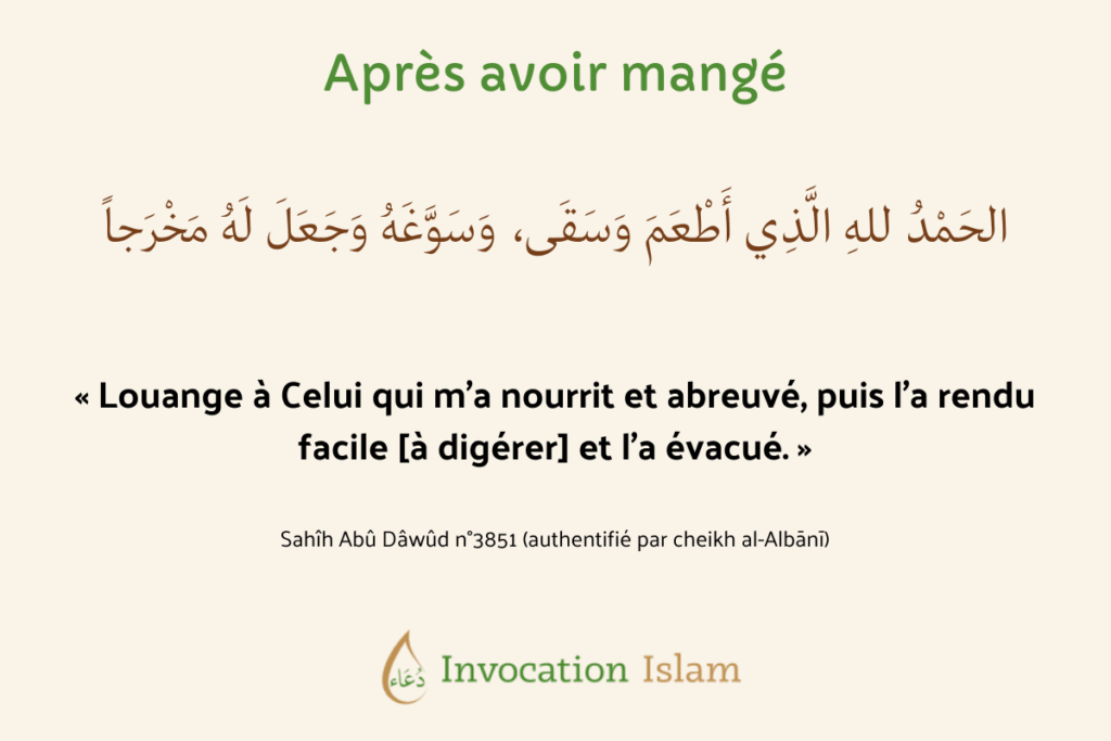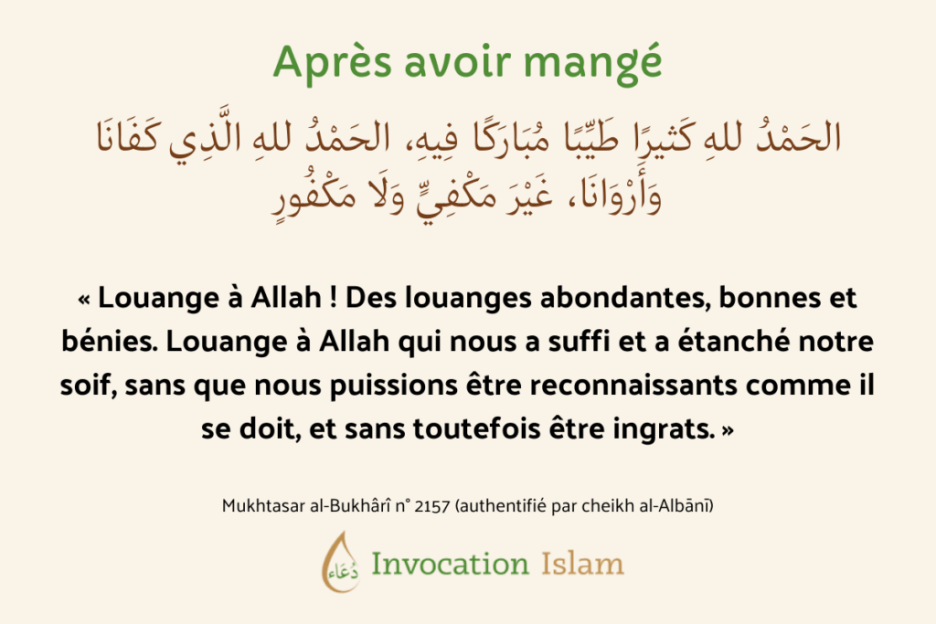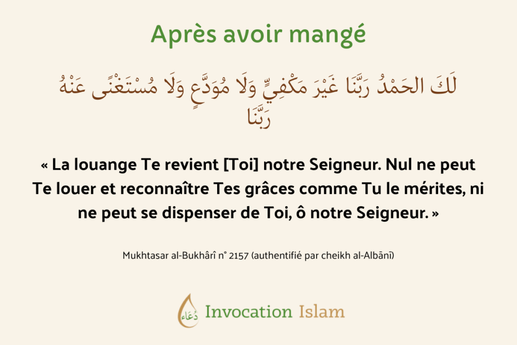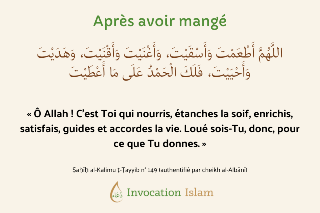 « Ô Allah ! C’est Toi qui nourris, étanches la soif, enrichis, satisfais, guides et accordes la vie. Loué sois-Tu, donc, pour ce que Tu donnes. »