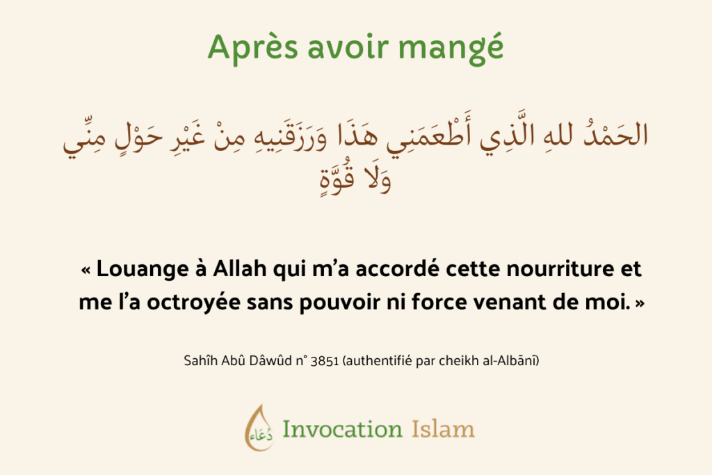 « Louange à Allah qui m’a accordé cette nourriture et me l’a octroyée sans pouvoir ni force venant de moi. »