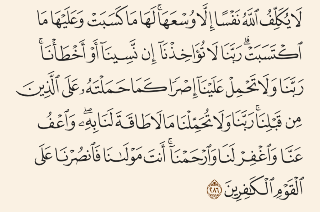 Allah n’impose à aucune âme une charge supérieure à sa capacité. Elle sera récompensée du bien qu’elle aura fait, punie du mal qu’elle aura fait. “Seigneur, ne nous châtie pas s’il nous arrive d’oublier ou de commettre une erreur. Seigneur, ne nous charge pas d’un fardeau lourd comme Tu as chargé ceux qui vécurent avant nous. Seigneur, ne nous impose pas ce que nous ne pouvons supporter. Efface nos fautes, pardonne-nous, fais-nous miséricorde. Tu es notre Maître, donne-nous donc la victoire sur les peuples infidèles. (S.2- V.286)