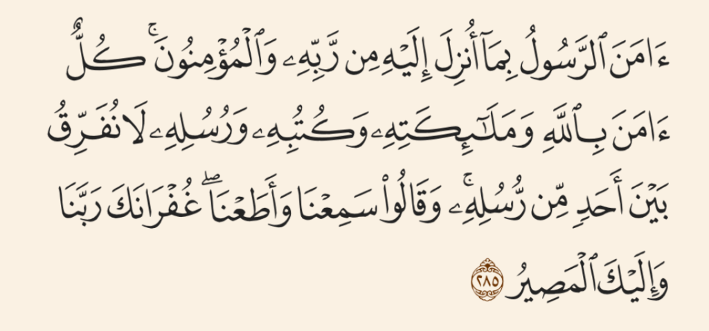 Le Messager a cru en ce qu’on a fait descendre sur lui venant de son Seigneur, et les croyants aussi. Tous ont cru en Allah, en Ses anges, à Ses Livres et en Ses messagers. (Ils disent) : “Nous ne faisons aucune distinction entre Ses messagers”. Et ils ont dit : “Nous avons entendu et obéi. Seigneur, nous implorons Ton pardon. C’est vers Toi que sera le retour.” (S.2- V.285)
